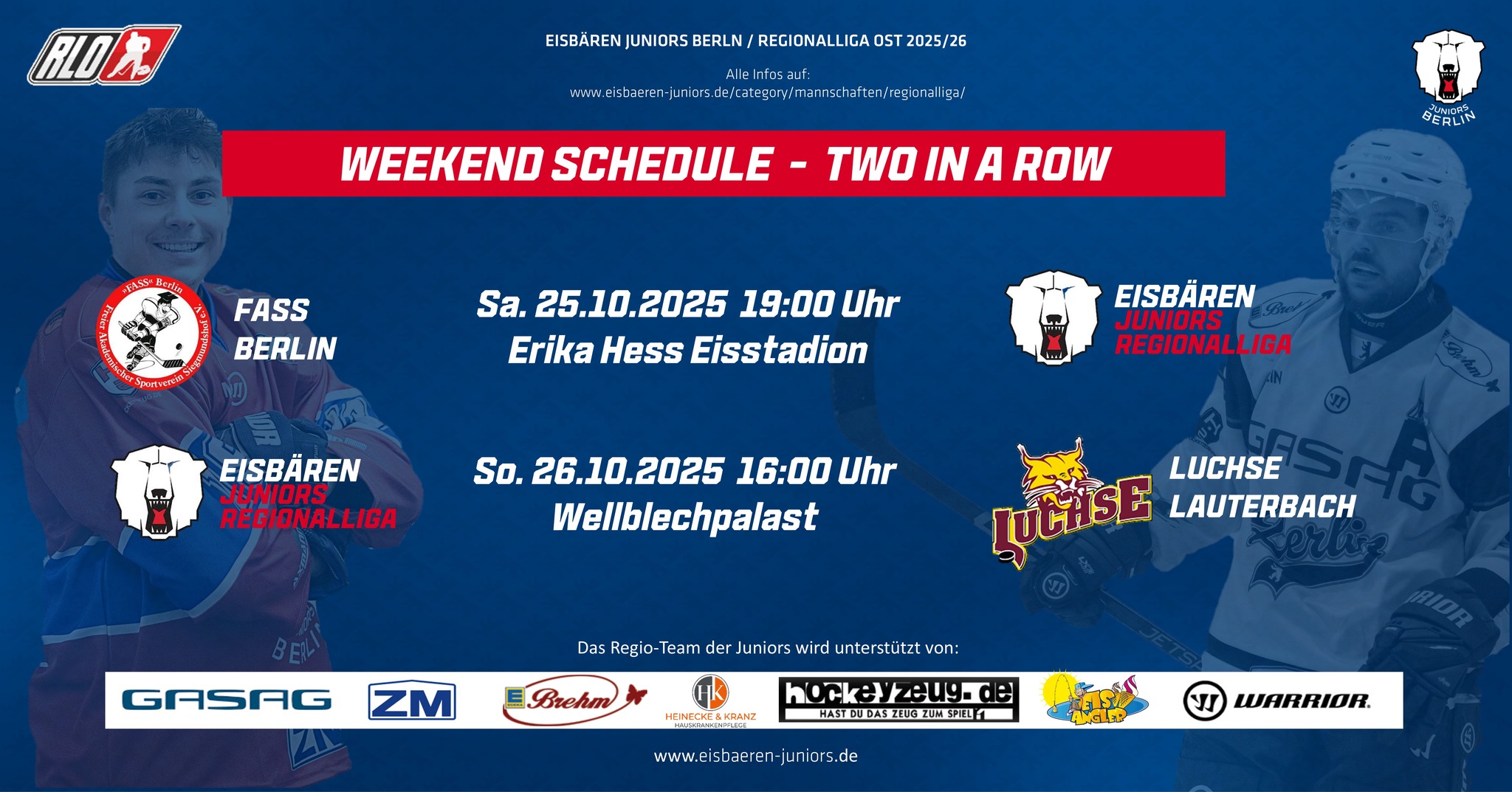 Das kommende Wochenende hat es in sich, die Regio-Juniors müssen doppelt ran. Am Samstag spielen sie im wiedereröffneten Erika Hess Eisstadion ihre zweite Saisonpartie gegen Stadtrivale FASS Berlin. Der erste Vergleich ging auf eigenem Eis mit 0:9 glatt an den amtierenden Meister aus dem Wedding, diesmal wollen die Hohenschönhausener das Spiel deutlich enger gestalten. Vielleicht hilft hierbei die kleinere und somit engere Eisfläche mit NHL-Abmaßen, die im FASS-Stadion vorübergehend angelegt wurde.