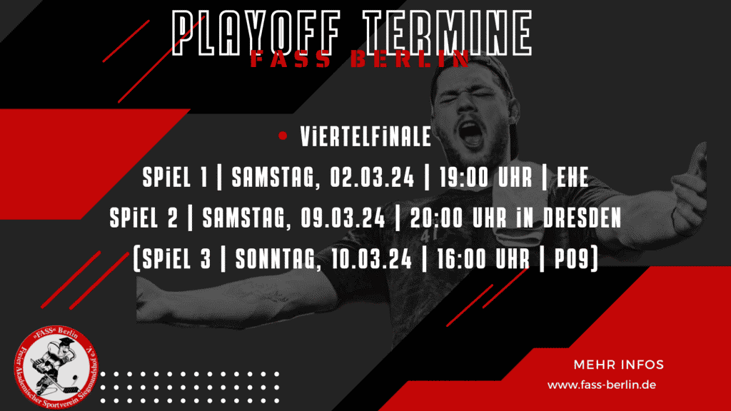 Für FASS Berlin geht es darum, zunächst das Viertelfinale zu überstehen. Gegner ist der ESC Dresden, welcher die Hauptrunde auf Rang 8 abgeschlossen hat. Alle drei Saisonspiele gegen diesen Gegner hat FASS klar gewonnen, doch in den Play-offs werden die Dresdner mit einem anderen Gesicht (spricht: einem stärkeren Kader) antreten. Los geht es mit Spiel 1 am Samstag (02.03.34, 19:00 Uhr) im Erika-Heß-Eisstadion.
