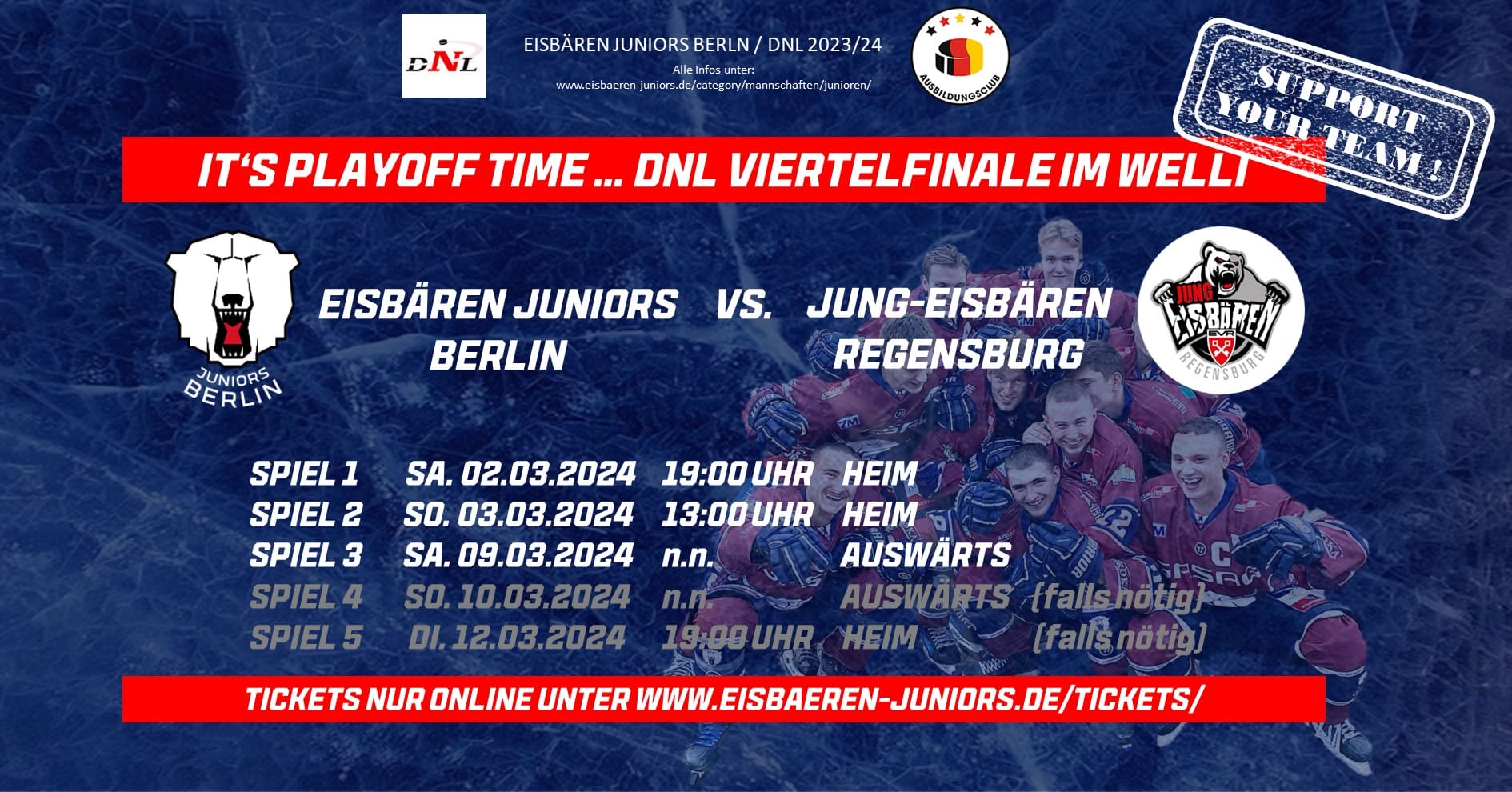Gegner im Viertelfinale sind die Jung-Eisbären Regensburg, gespielt wird im Modus Best-of-5. Am Samstag um 19:00 Uhr und am Sonntag um 13:00 Uhr finden die ersten beiden Heimspiele statt. Eine Woche später geht es in Regensburg weiter. Sollte ein 5. Spiel erforderlich sein, findet dieses am Dienstag, dem 12. März um 19:00 Uhr im Welli statt.