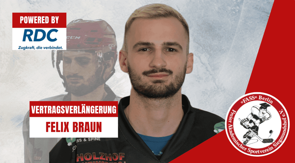 Felix Braun hat sich in seiner Zeit bei FASS Berlin (seit 2020) zu einem Führungsspieler entwickelt. Trainer und Teamkollegen haben dies mit dem „A“ auf seinem Trikot und der Berufung in den Mannschaftsrat gewürdigt. Jetzt hat der pfeilschnelle Außenstürmer sein Engagement im Erika-Heß-Eisstadion um zwei Jahre verlängert.