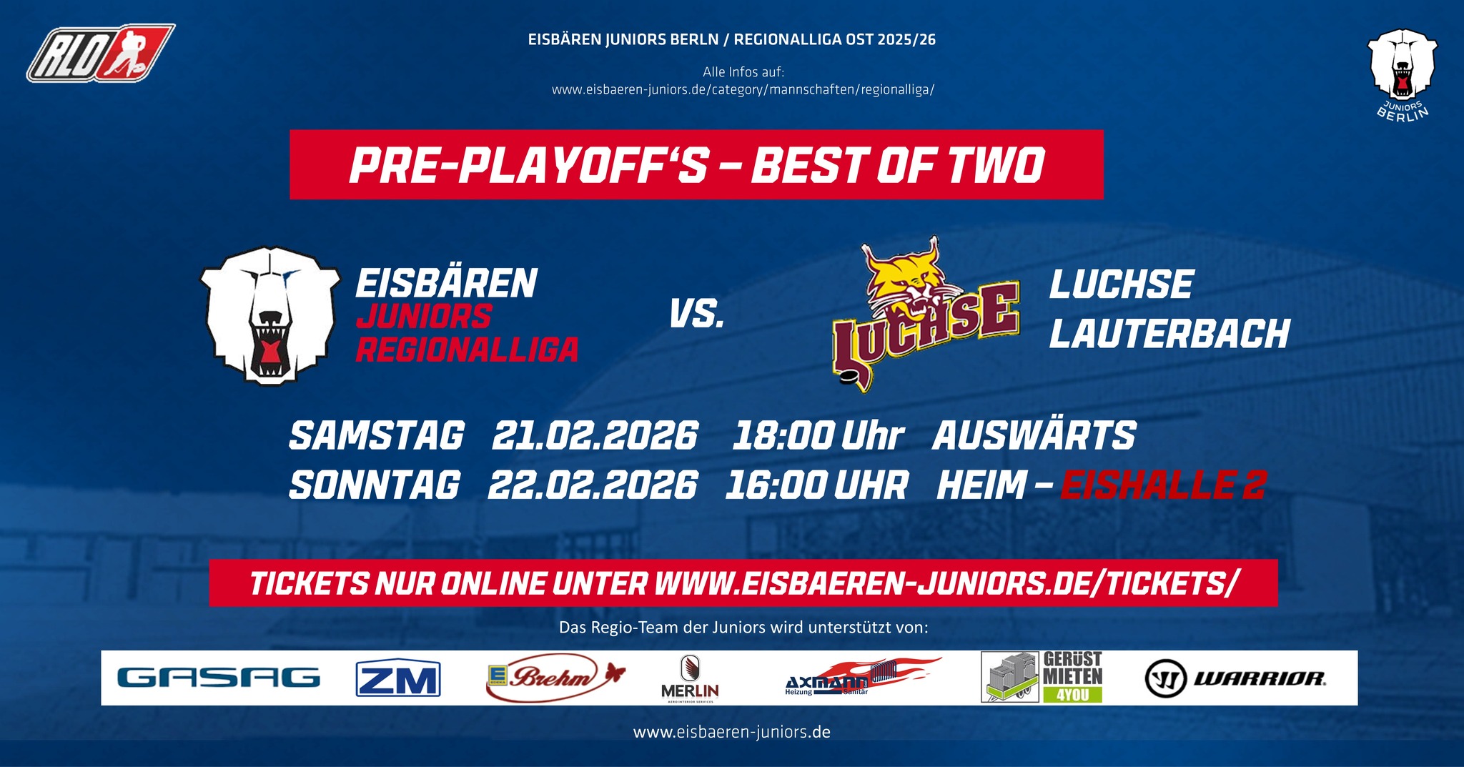 Regulär hätten die Luchse aufgrund ihrer besseren Platzierung das Recht gehabt, ihr Heimspiel am zweiten Tag der kurzen Best-of-two-Serie auszutragen und wären somit am Samstag nach Berlin gekommen. Da aber der Wellblechpalast durch eine internationale Eiskunstlaufveranstaltung blockiert ist, fahren die Juniors nun zu Spiel 1 zuerst nach Lauterbach und empfangen dann am Sonntag die Hessen in Berlin. Eine weitere Besonderheit bleibt - aufgrund der Rückbauarbeiten im Welli, wird das Heimspiel in der direkt daneben befindlichen Eishalle 2 des Sportforums ausgetragen.